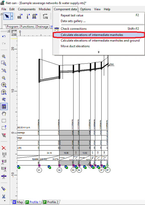 Skorzystanie z funkcji "Oblicz rzędne studzienek pośrednich" powoduje, iż program na podstawie zaznaczonych odcinków i rzędnej ich węzłów końcowych (najczęściej studni) wylicza spadek wspólny na całości tej trasy. Istotne jest, że dla utrzymania wspólnego spadku program narzuca nowe rzędne początku i końca każdego odcinka na stałe.