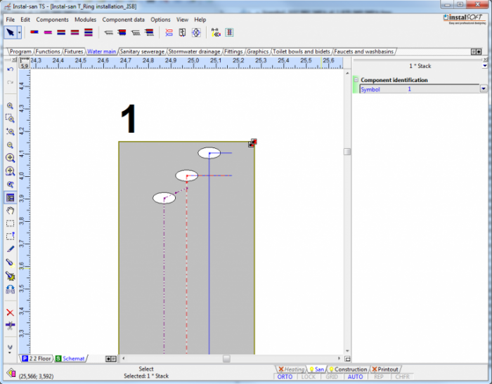 - Wczytać plik z przygotowaną, przedstawioną na rzutach konstrukcją oraz fragmentem instalacji obejmującym odbiorniki oraz piony wodociągowe.