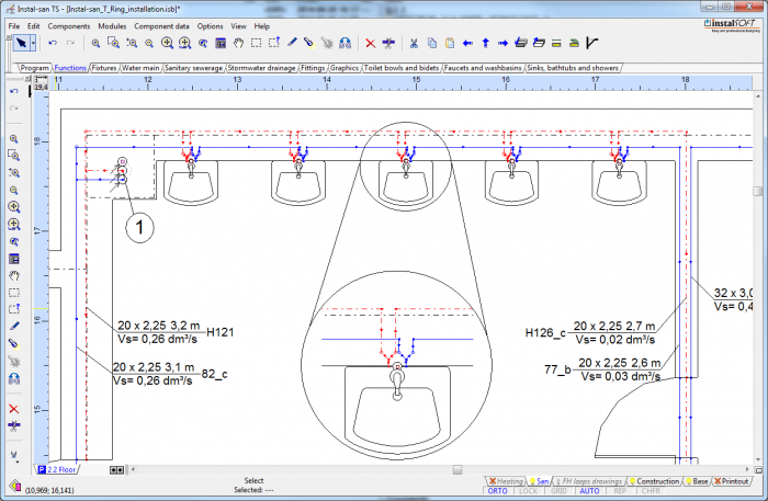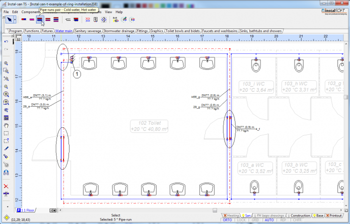 - Wstawić na każdej kondygnacji działki z.w.u. i c.w.u. w formie niedomkniętego pierścienia otaczającego zasilane odbiorniki. Program pozwoli na domknięcie pierścienia po podłączeniu odbiorników.