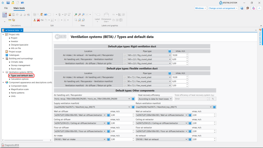 • Instalacje wentylacyjne / Typy i dane domyślne – wybrać domyślne typy: