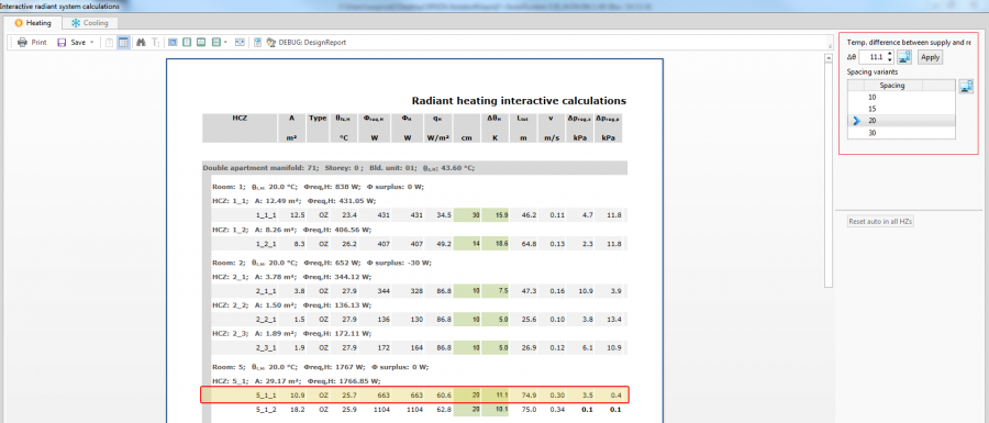 "Obliczenia interaktywne systemów płaszczyznowych" - w oknie obliczeń edycja wartości różnicy temperatury pomiędzy zasilaniem a powrotem, edycja odstępów układania. Po zmianie tych wartości projekt jest przeliczany, automatycznie wyświetlane są aktualne wyniki.
